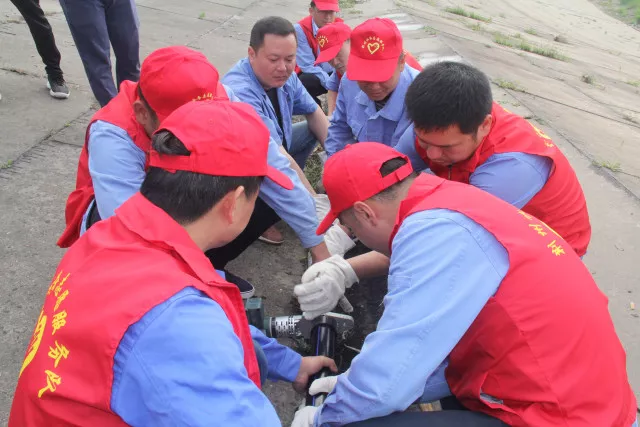 經(jīng)過(guò)前期認(rèn)真檢查和充分的準(zhǔn)備,當(dāng)天上午志愿者們頂著驕陽(yáng)開始了作業(yè)。由于維修作業(yè)需要電源,但發(fā)電機(jī)組體積大重量沉且需要翻越江岸護(hù)欄,黨員同志們團(tuán)結(jié)合作,肩扛手抬,克服重重困難,用了3個(gè)小時(shí)的時(shí)間成功完成了破損管段的修復(fù)。為確保一米線不被江水沖走,大家又對(duì)一米線加設(shè)了8根鋼絲予以加固,并對(duì)系在救生水管上的浮力輪胎進(jìn)行捆扎。加固后的“一米線”安全性能大大得到了提高。