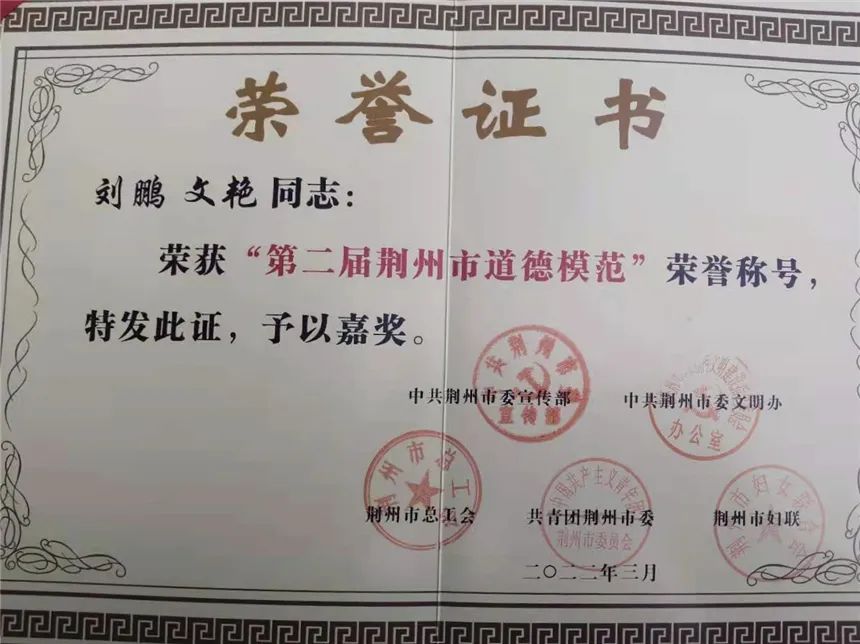劉鵬的英勇事跡打動(dòng)了很多人,先后被評(píng)為“2021年荊州水務(wù)集團(tuán)見(jiàn)義勇為個(gè)人”“ 2021年沙市區(qū)見(jiàn)義勇為先進(jìn)個(gè)人”“ 2021年荊州市見(jiàn)義勇為先進(jìn)個(gè)人”“2021年第一、二季度荊州好人”“ 第二屆荊州市道德模范”等榮譽(yù)稱(chēng)號(hào)。