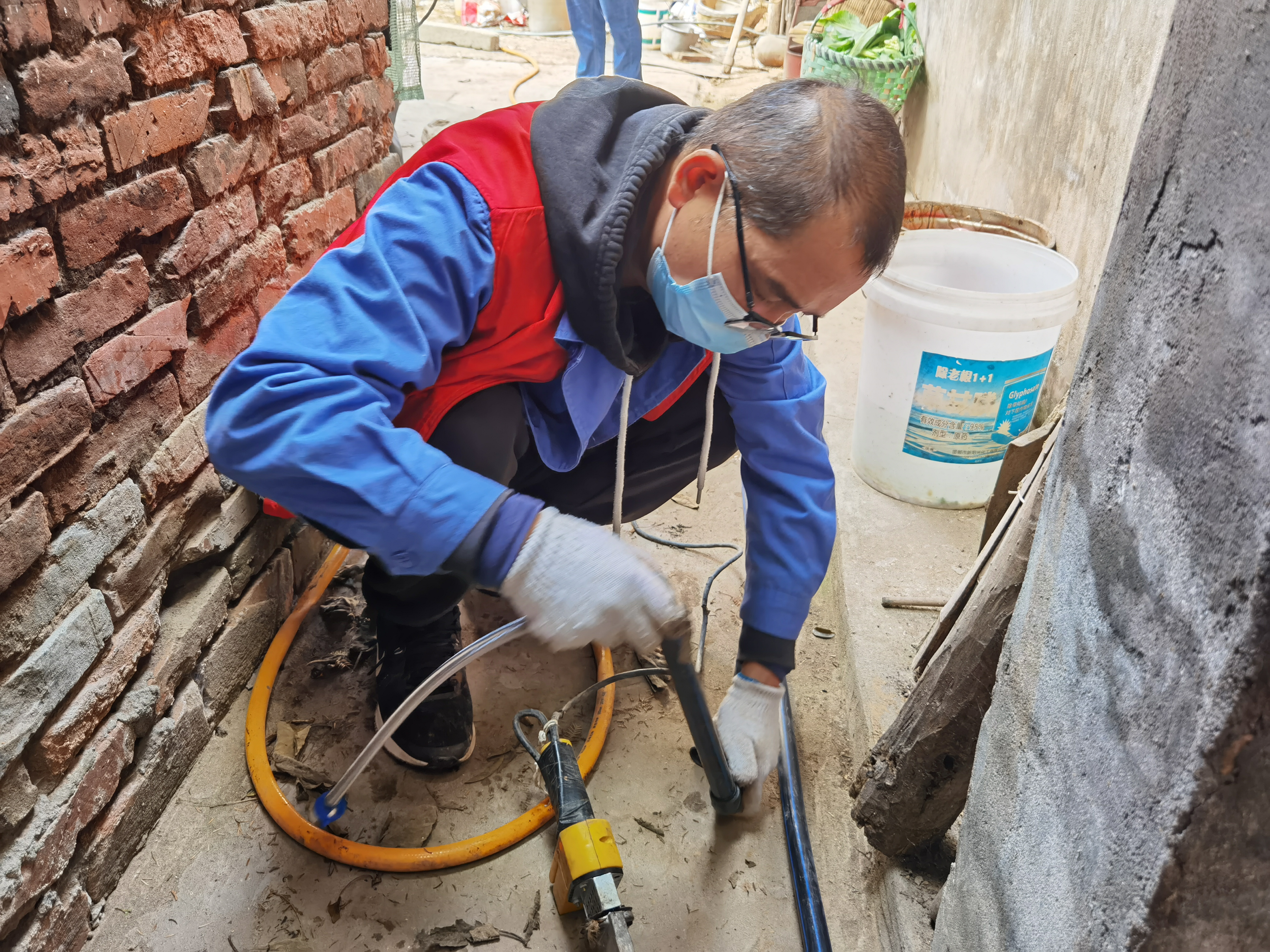 現(xiàn)場情況雖然不算復(fù)雜,但已經(jīng)被水泥硬化的路面還是給施工帶來了不小的難度,整整一個上午,前來維修的城南客服中心“三微服務(wù)志愿隊(duì)”沒有絲毫停歇,他們分頭協(xié)作,通力配合,有的人負(fù)責(zé)施工設(shè)計(jì),有的人負(fù)責(zé)材料準(zhǔn)備,有的人負(fù)責(zé)與老兩口說說話、談?wù)勑?,撫慰老人的心靈。臨近中午時,維修工作終于完成,這一次幫扶共使用PE管材18米,各類彎頭、三通等管制件十多個,設(shè)計(jì)并安裝了一條將廁所與豬圈相連的管道,為了方便老人養(yǎng)豬,還為老兩口分別接通了2個便于洗手和清洗豬圈的水龍頭,盡全力為老兩口帶來更加便利優(yōu)質(zhì)的用水服務(wù)。