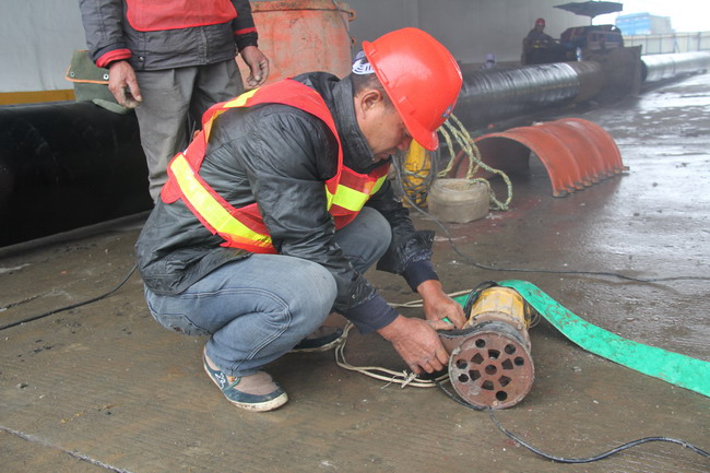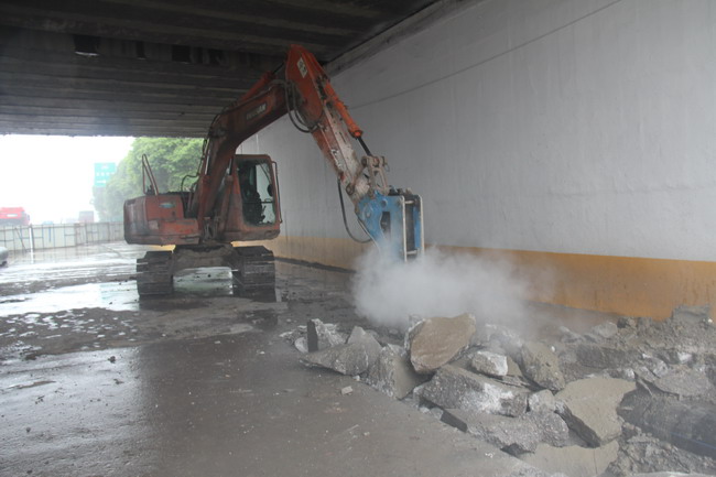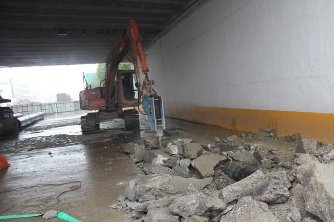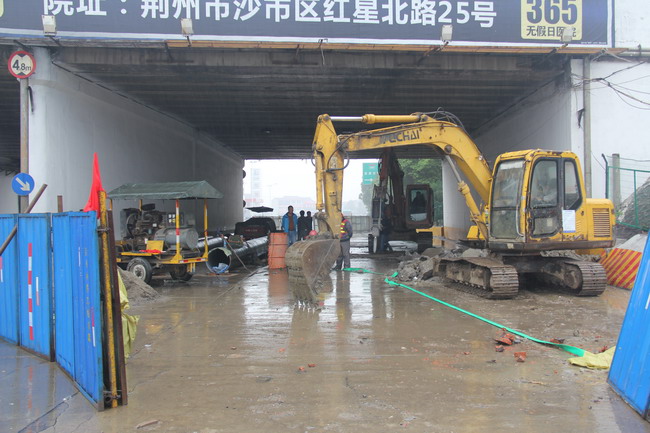 20日上午,天雖然下著大雨,但在東方大道與滬渝高速交匯處的橋洞現(xiàn)場,卻一片忙碌景象,只見橋洞前后設(shè)置著鮮艷的交通警示標(biāo)志,對(duì)來往車輛實(shí)行導(dǎo)流,向左邊橋洞安全通行。右邊橋洞下,水務(wù)集團(tuán)的施工人員身著反光服正在不停的忙碌,挖掘機(jī)對(duì)路面進(jìn)行開挖,發(fā)出聲聲轟響,不遠(yuǎn)處整齊擺放著防腐完成的鋼管,等待溝槽開挖完畢后進(jìn)行安裝。據(jù)現(xiàn)場負(fù)責(zé)的項(xiàng)目經(jīng)理黃凱亮介紹,東方大道全線鋪設(shè)的是PE供水管,在滬渝高速橋洞下方的管道因橋臺(tái)基礎(chǔ)高度受限,管道埋深較淺,同時(shí)遭遇大型重載車輛的長期頻繁輾壓,開始發(fā)生滲漏現(xiàn)象,為確保供水安全,此次管改將對(duì)該段近128米管道進(jìn)行更換,重新安裝耐壓的鋼管,鋼管安裝后采用細(xì)砂回填,并在管頂采用C30鋼筋混凝土封層還原,從而提高管道的抗壓能力。