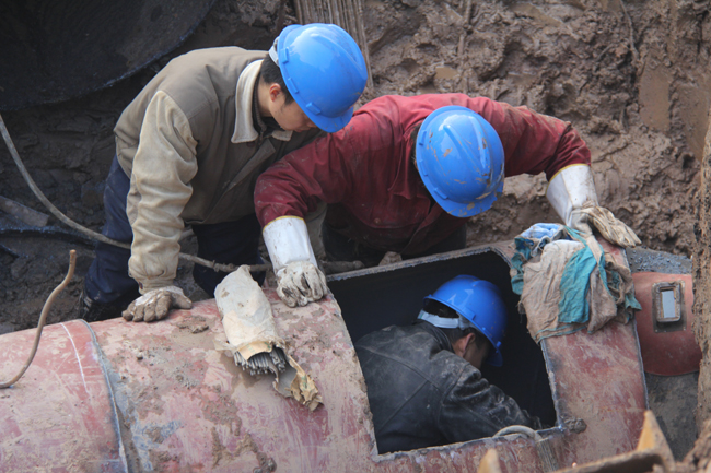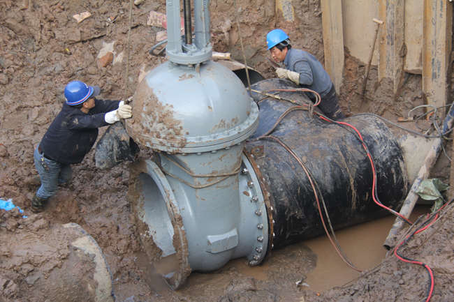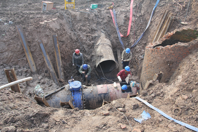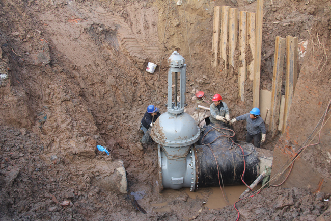 1月12日晚8:00時(shí),工作人員在南湖水廠集合,按照預(yù)定時(shí)間南湖水廠將清水庫水位降至1米以下后,再分期、分批由小組長帶隊(duì)下到清水庫開始清洗工作,由于夜間地下作業(yè),并且天氣較寒冷,為保障人身安全,每半小時(shí)由小組長詢問組員身體狀況并向負(fù)責(zé)人匯報(bào),清洗二小時(shí)上地面休息30分鐘再清洗。1月13日凌晨4:00時(shí)清水庫清洗工作完成。于此同時(shí),地面上也在緊張作業(yè)。兩處清水庫水管連接處分別開挖了一個(gè)5米深、300平方的工作坑,凌晨4:00時(shí),清水庫排空清洗完成后,管網(wǎng)斷接、吊裝、焊接工作開始進(jìn)行。集團(tuán)公司總經(jīng)理張勤、副總經(jīng)理唐志國等領(lǐng)導(dǎo)分別到現(xiàn)場查看指導(dǎo)。1月13日下午6:00,整個(gè)工程順利完成。