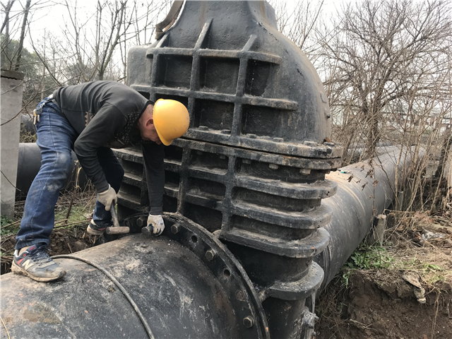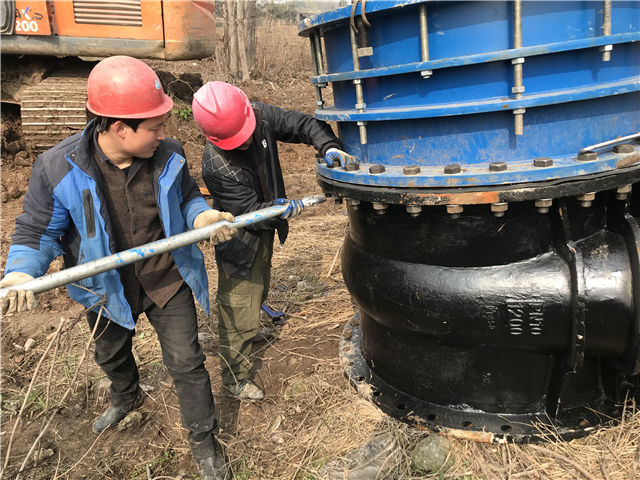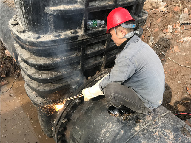 故障閥門拆除后,旋即著手新閥門的安裝。由于新閘體積較原閥小了許多,因此還必須在連接處焊接一根50厘米左右的伸縮器。作為重要環(huán)節(jié),為確保連接處嚴(yán)絲合縫,焊接過程必須做到分毫不差,電焊師傅們站在齊腰深的水坑里彎著腰進(jìn)行焊接,盡管火花四濺,盡管衣服已全部淋濕,盡管一彎就是1個(gè)小時(shí),但他們卻不敢有片刻的放松。