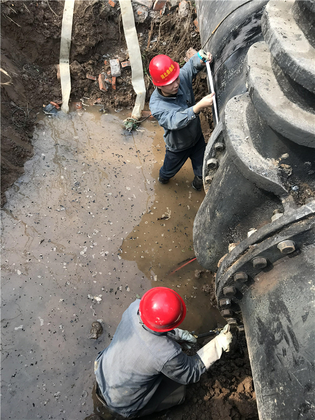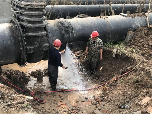 在施工作業(yè)面開挖時(shí),由于該閥門緊連輸水管,且旁邊就是居民房屋,為確保不對(duì)水管和房屋造成損壞,工作人員采用了人工開挖的方式。一個(gè)多小時(shí)后開挖工作告一段落,進(jìn)入閥門拆除環(huán)節(jié)。經(jīng)過仔細(xì)觀察,該閥門因已投入使用多年,且位于露天環(huán)境下,由于風(fēng)吹日曬雨淋,用于管道和閥門連接的螺桿早已銹蝕,需要通過氧割進(jìn)行拆除。然而在切割過程中,卻遇到了突發(fā)情況:廠內(nèi)出水管連通閥因不能完全關(guān)停閉死,導(dǎo)致切割處主管大量漏水,切割工作無法正常進(jìn)行,若帶水作業(yè)將大大影響施工質(zhì)量。眼看著水流不住的噴涌而出,現(xiàn)場(chǎng)的施工員們心急如焚,如何快速關(guān)停供水主管閥門,止住漏水成了迫在眉睫的關(guān)鍵問題。