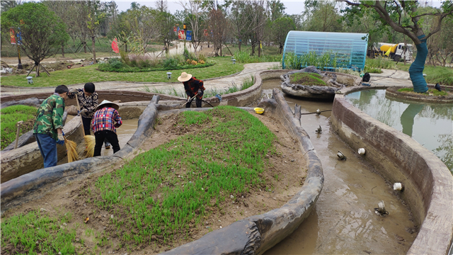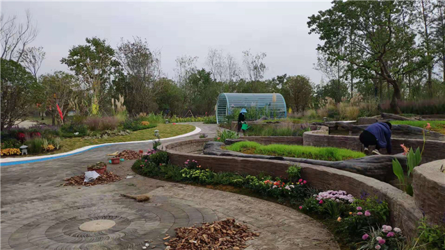 綠化部分完成:水生植物栽植,云盆內播撒麥籽,苗木已基本栽植完畢,撒樹皮覆蓋綠化土,整理展園附近公共區(qū)域綠化;