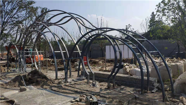 1、休息亭鋼結構安裝完成60%、骨架及坐凳焊接完成,展廳鋼構件已安裝完畢,大門景觀構架已完成,水務LOGO骨架焊接安裝完畢,休息亭、展廳、大門骨架油漆完成,安裝展廳內側亞克力板;