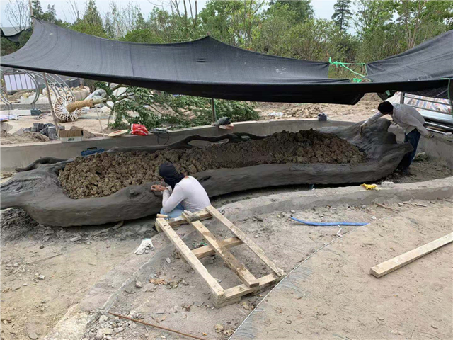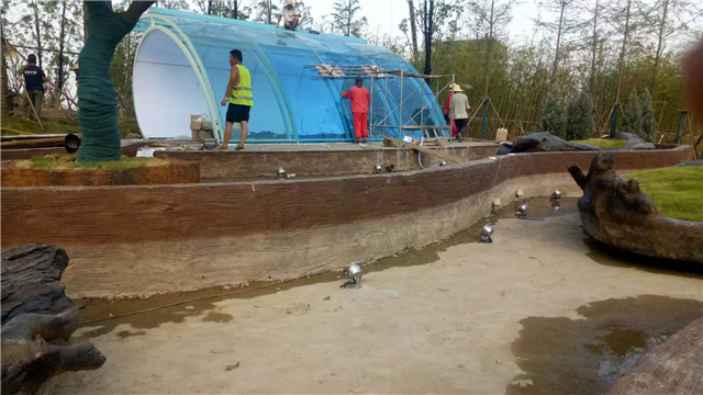 3、云盆磚砌結構及造型完成,混凝土懸浮底板澆筑完成,加高整改云盆及池壁低于水位的部分,裝飾抹灰完成,飾面碳化木顏色油漆完成70%;