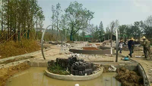 水電部分完成:安裝水底燈、射燈、草坪燈,全園燈具已安裝完畢,展廳水幕封邊安裝完畢,水幕用綠化水管試水,主泵坑安裝活動蓋板。