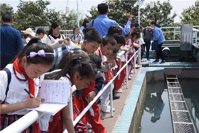 由于本次參加人數(shù)太多,工作人員和老師按照班級(jí)有序組織四個(gè)班分批上水池進(jìn)行參觀。“這里是制水最核心的工藝,江水經(jīng)過加礬環(huán)節(jié)后,在這里進(jìn)行反應(yīng)、沉淀、過濾后,變成潔凈的自來水……”小學(xué)生們?cè)诔恋沓氐臋跅U前,認(rèn)真聽取工作人員的講解,還不停提問,手里拿著本子和筆不時(shí)地在寫著。