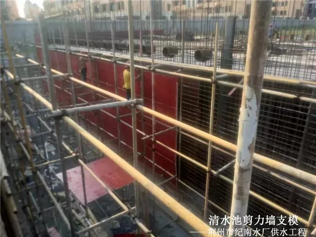 8月份主要實施給水構(gòu)筑物清水池的主體施工,對清水池南側(cè)四、五、六號塊池柱澆筑,南側(cè)一號塊頂板及剪力墻驗筋驗?zāi)?;剪力墻綁扎鋼筋及支模,加工清水池頂板鋼筋等。對送水泵房附屬配電間進行放線、土方開挖和標(biāo)高測量。