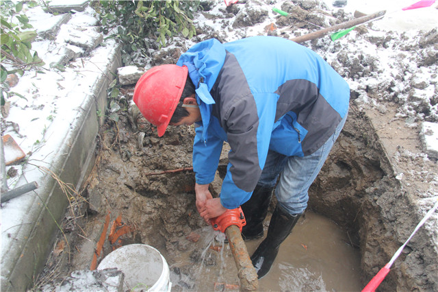 1月24日早上,伴隨著冰雪天氣的出現(xiàn),氣溫降至零度以下。荊州水務(wù)集團(tuán)管網(wǎng)搶修隊(duì)接到報(bào)障電話后,來到工商局宿舍樓前,對(duì)受凍故障的閥門進(jìn)行了更換。搶修現(xiàn)場(chǎng)只有零下3℃,搶修員鄭倫軍站在冰水中更換閘閥。為不影響其他居民用水,鄭倫軍采取帶水作業(yè)的方式更換閥桿。冰冷的水直撲向鄭倫軍的臉上、身上和腿上,他顧不上身體的寒冷,用被凍得通紅的手迅速地?cái)Q動(dòng)螺絲,用最快的速度恢復(fù)供水。