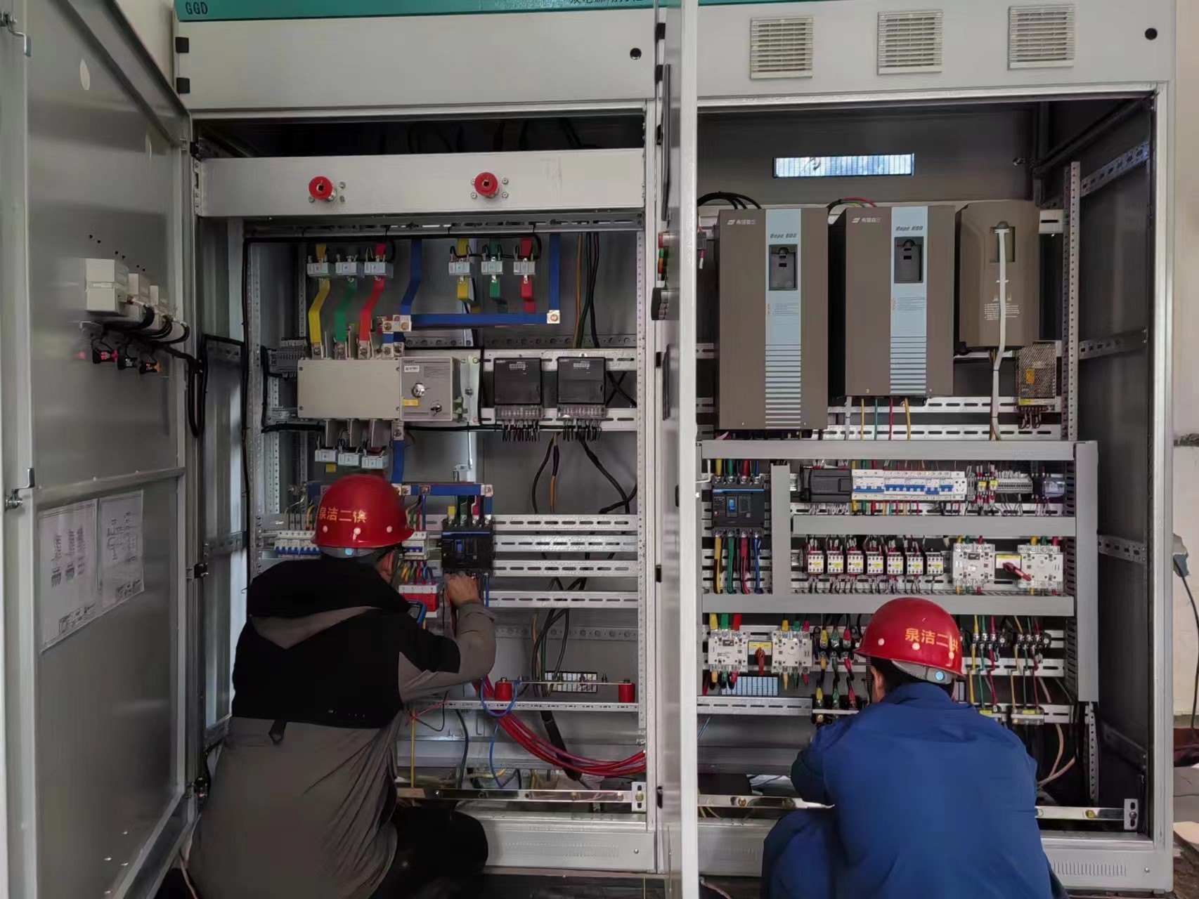 到達(dá)水廠后,經(jīng)過對所有設(shè)備的詳細(xì)檢查和評估,很快技術(shù)員們便商討出了可靠高效的整改方案,在當(dāng)?shù)厮畯S工作人員的全力配合下,整改工作緊鑼密鼓地開展了起來。由于水廠房門尺寸過小,變頻控制柜的體積較大,無法直接從門直接抬進(jìn)去,這讓我們在搬運過程中遇到了不小的困難。好在大家不懼艱險、開動腦筋,拆掉窗戶玻璃之后把配電柜從窗口抬入。看似簡單的工作,卻讓八名技術(shù)員在寒冬臘月累得滿頭大汗。正因為有這樣一群專業(yè)而又熱情洋溢的技術(shù)員堅持不懈的努力,才使整個設(shè)備升級改造工作進(jìn)行地十分順利。又因任務(wù)本身十分艱巨,一直到晚八點,歷經(jīng)十二個小時,工作才圓滿完成。