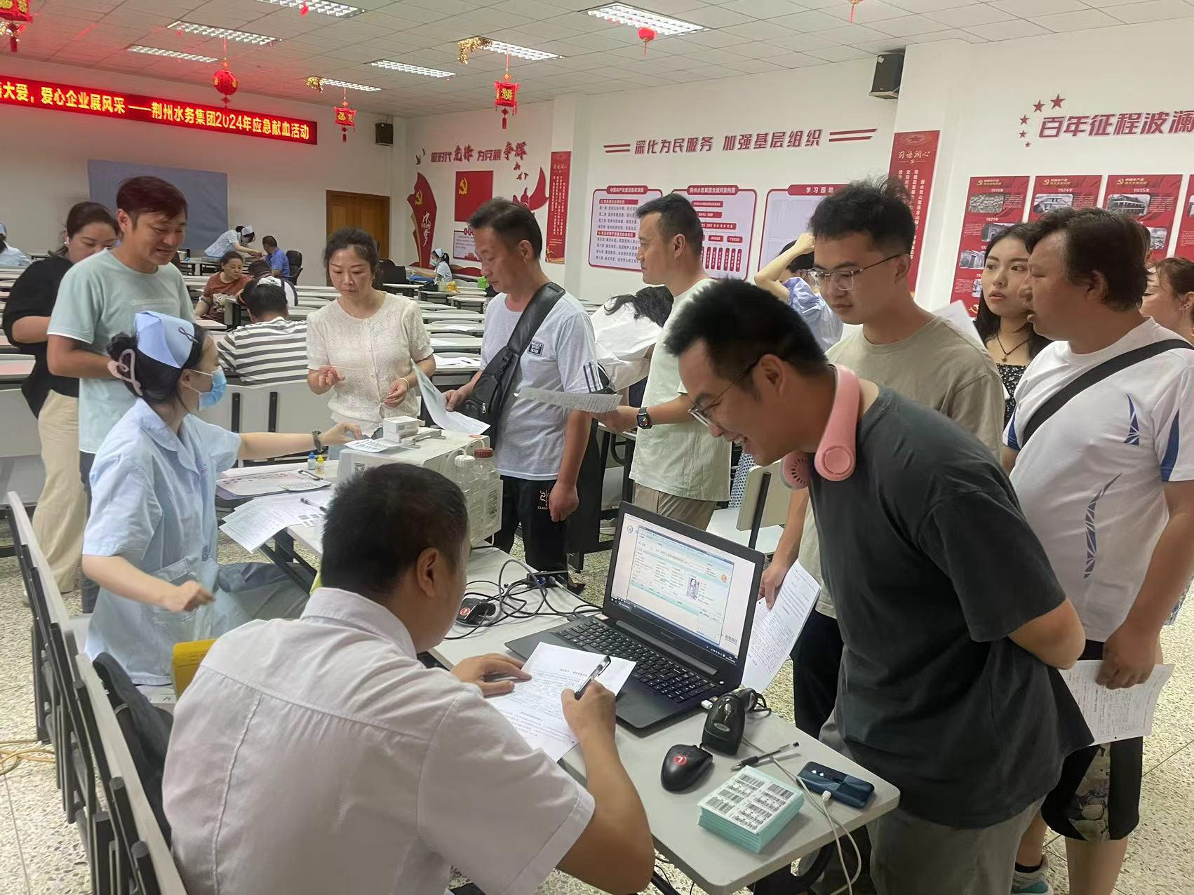 雖然正值炎炎夏日但也抵擋不住大家傳遞愛心的熱情,在獻血活動正式開始之前,已有許多員工早早到來等候獻血,不一會兒采集登記處前就排成了一條長龍,員工們在醫(yī)護人員的細心指導下,依次完成獻血登記、健康征詢、血液初篩、血液抽取等各項流程,挽起衣袖捐獻血液。他們當中既有多年獻血的“熱血老兵”,也有剛剛開啟獻血之旅的“新兵”, 還有一些員工獻血熱情很高,卻因為不符合獻血條件失望而歸,整個活動現(xiàn)場人流涌動,氣氛熱烈祥和,處處洋溢著溫馨與感動。經(jīng)統(tǒng)計,本次活動共有近60名員工成功獻血,總獻血量達20000毫升。大家紛紛表示“能為社會貢獻自己的一份力量,幫助更多身處險境的人,是一件非常有意義的事”。