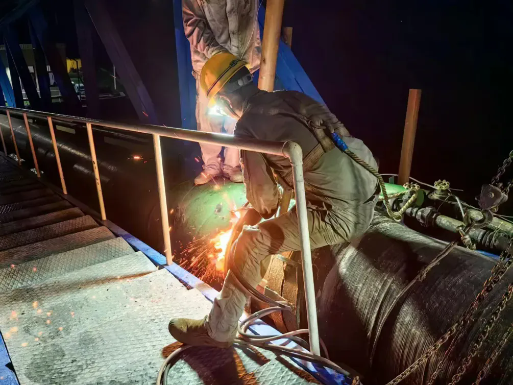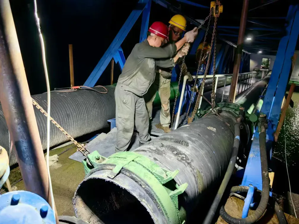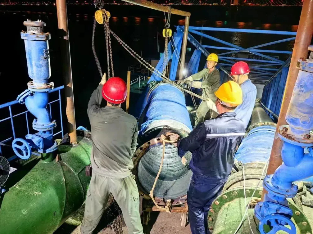 方案確定后,全體工作人員分工明確、各司其職。從下午14:30取水泵站的施工開始,生產(chǎn)調(diào)度、施工組織、外部協(xié)調(diào)、后勤保障等前期工作都有條不紊的按計(jì)劃進(jìn)行,待一切準(zhǔn)備就緒,至晚上21點(diǎn)取水橡膠管更換施工正式進(jìn)行。施工員們分工協(xié)作,首先對舊管道進(jìn)行氧切割拆除,再進(jìn)行新管道連接。由于施工現(xiàn)場位于江面高空,施工難度大,危險(xiǎn)性高。但施工員們沉著冷靜,利用嫻熟的施工技藝,僅用六個多小時就完成了全部更換工作,取水管道恢復(fù)正常取水運(yùn)行。