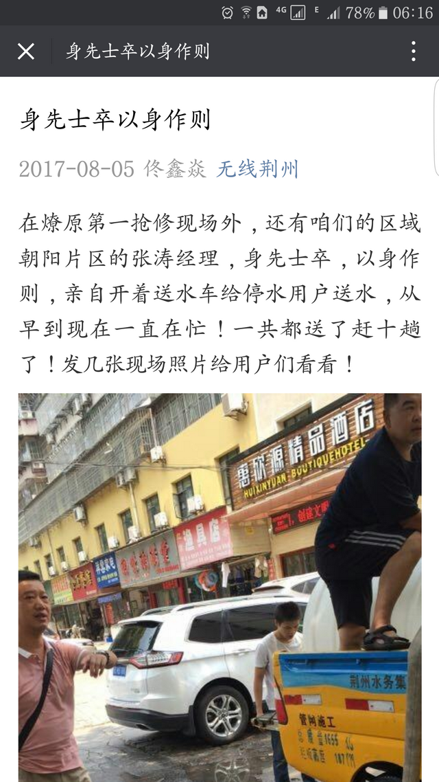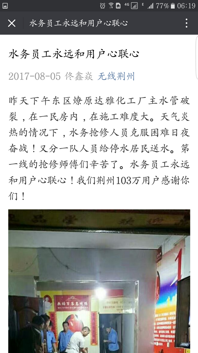 在送水過程中,有許多居民都對(duì)水務(wù)集團(tuán)及時(shí)采取的送水服務(wù)表示感謝。雖然天氣炎熱,停水為大家的生活帶來了不便,但是這次緊急送水服務(wù)工作還是得到了用戶們的感謝也獲得了極大的肯定,大家一致認(rèn)為水務(wù)集團(tuán)急用戶之所急,水務(wù)集團(tuán)的干部員工在這么炎熱的天氣下的確是真心為用戶服務(wù),轄區(qū)內(nèi)的一名叫佟鑫焱的用戶十分關(guān)心這次搶修服務(wù)工作,她親眼目睹了這次水務(wù)集團(tuán)的搶修和送水服務(wù)工作后,非常感動(dòng)并且通過無線荊州發(fā)表了《水務(wù)員工永遠(yuǎn)和用戶心連心》、《身先士卒以身作則》兩份文章實(shí)時(shí)報(bào)道了水務(wù)集團(tuán)這次搶修服務(wù)工作,引起了較大的反響,廣大群眾紛紛跟帖點(diǎn)贊。