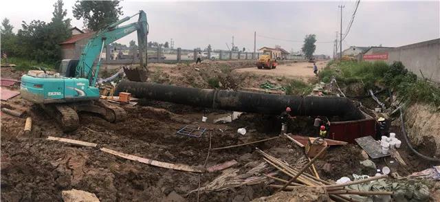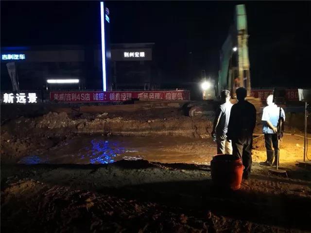 6月12日晚7點(diǎn),荊監(jiān)一級公路楊場收費(fèi)站附近DN400 供水管道被路政施工人員打穿破裂,自來水噴涌而出,周邊瞬間成為汪洋。接到報漏電話后,公司24小時搶險值班隊伍半個多小時便趕到了現(xiàn)場,果斷在第一時間關(guān)閥止水。為了加快搶修進(jìn)度,及時恢復(fù)沿線用戶供水,在已是夜間且管道埋藏較深的情況下,搶修人員克服困難,多方協(xié)調(diào)了鋼板樁打樁機(jī)及長臂挖機(jī)等大型機(jī)械設(shè)備,經(jīng)過緊張、有序、繁重的施工后,在次日凌晨7時開挖出被破壞的供水管道。隨后搶修人員又爭分多秒,在已是連續(xù)奮戰(zhàn)超過12個小時的情況下,又對破裂管道進(jìn)行清洗、修復(fù)、開閘等一系列工作,最終于13日9時恢復(fù)了供水。