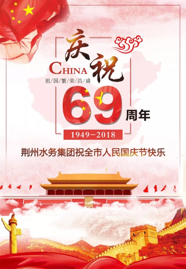 值此國(guó)慶佳節(jié)來臨之日,荊州水務(wù)集團(tuán)640名干部員工祝愿祖國(guó):風(fēng)調(diào)雨順、繁榮昌盛、國(guó)泰民安、生日快樂!