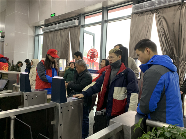 7點30分,荊州水務集團的10名青年志愿者便早早集結(jié)在荊州火車站站前廣場。他們身穿紅馬甲,頭戴小紅帽,頂著寒風細雨,分頭為過往旅客提供各類力所能及的幫助。他們中,有的在自動售票處指導乘客取票,有的在進站口幫助搬運行李和維護秩序,有的在檢票口幫助乘客讀取身份信息順利進站。他們以點滴行動踐行著“互相幫助、無私奉獻、不求回報”的志愿者精神,為這個寒冬注入了一股暖流,為這座城市增添了一抹色彩,更溫暖了一名又一名步履匆匆的返程旅客。