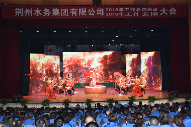 上午9:00,隨著一陣清脆鈴聲的響起,荊州水務(wù)集團(tuán)有限公司2019年年會(huì)暨頒獎(jiǎng)典禮正式拉開(kāi)序幕。伴隨著大屏幕上一幅幅照片、一段段視頻的徐徐播放,大家仿佛又被帶回那剛剛逝去的2018,心中滿是辛勤耕耘后的欣慰和自豪。一支喧天的舞蹈《戰(zhàn)鼓催春》更仿佛熊熊燃燒的火焰,瞬間點(diǎn)燃了全場(chǎng)的熱情,震天的鼓聲敲擊在每一位荊水人的心頭,同時(shí)也湊響了荊水人進(jìn)軍2019的號(hào)角。