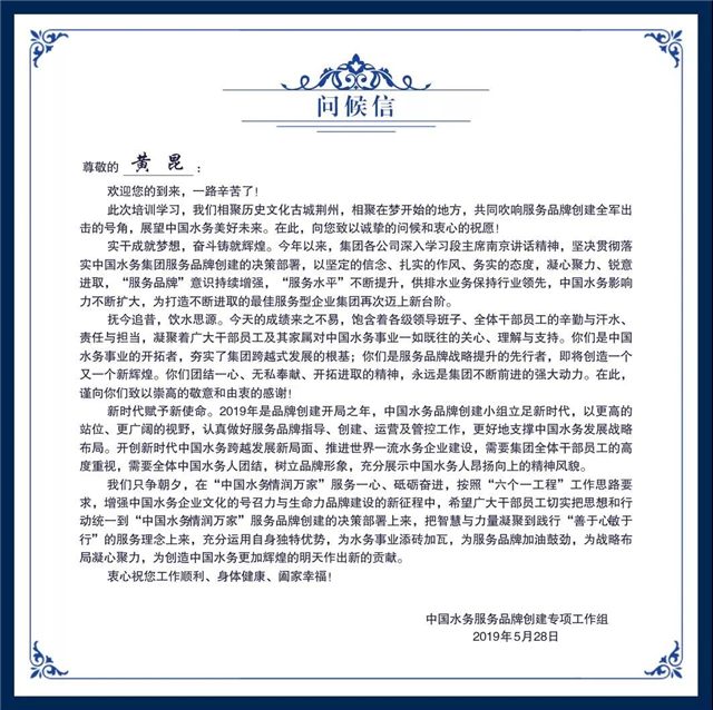 在第一期品牌創(chuàng)建培訓(xùn)會(huì)的結(jié)業(yè)典禮上,荊州水務(wù)常務(wù)副總經(jīng)理唐志國(guó),代表地方承辦方荊州水務(wù)服務(wù)品牌創(chuàng)建工作組在品牌創(chuàng)建培訓(xùn)會(huì)的“時(shí)光軸”上,留下了“開啟創(chuàng)建加速時(shí)光”的開篇之筆。學(xué)員們捧起培訓(xùn)結(jié)業(yè)證書,如待發(fā)之箭,奔向四方。