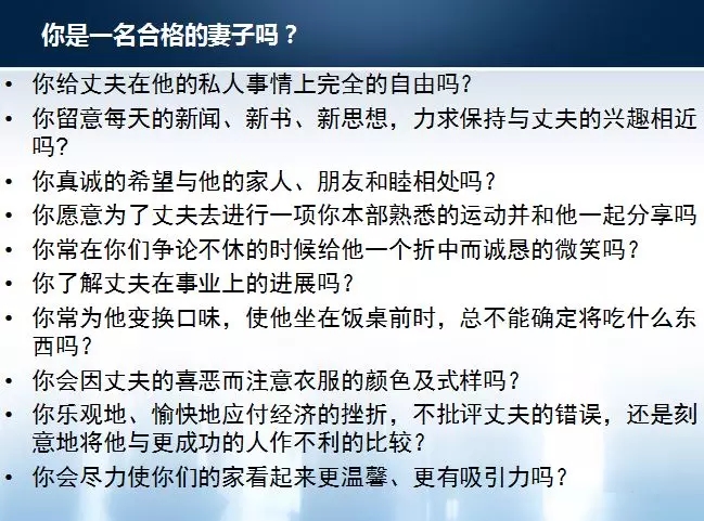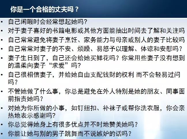你懂得你的妻子真正需要的是什么,會(huì)讓她時(shí)刻知道你有多愛(ài)她,讓她覺(jué)得嫁給你是這一生最明智道德選擇。放心吧,你的妻子也不會(huì)讓你失望的!