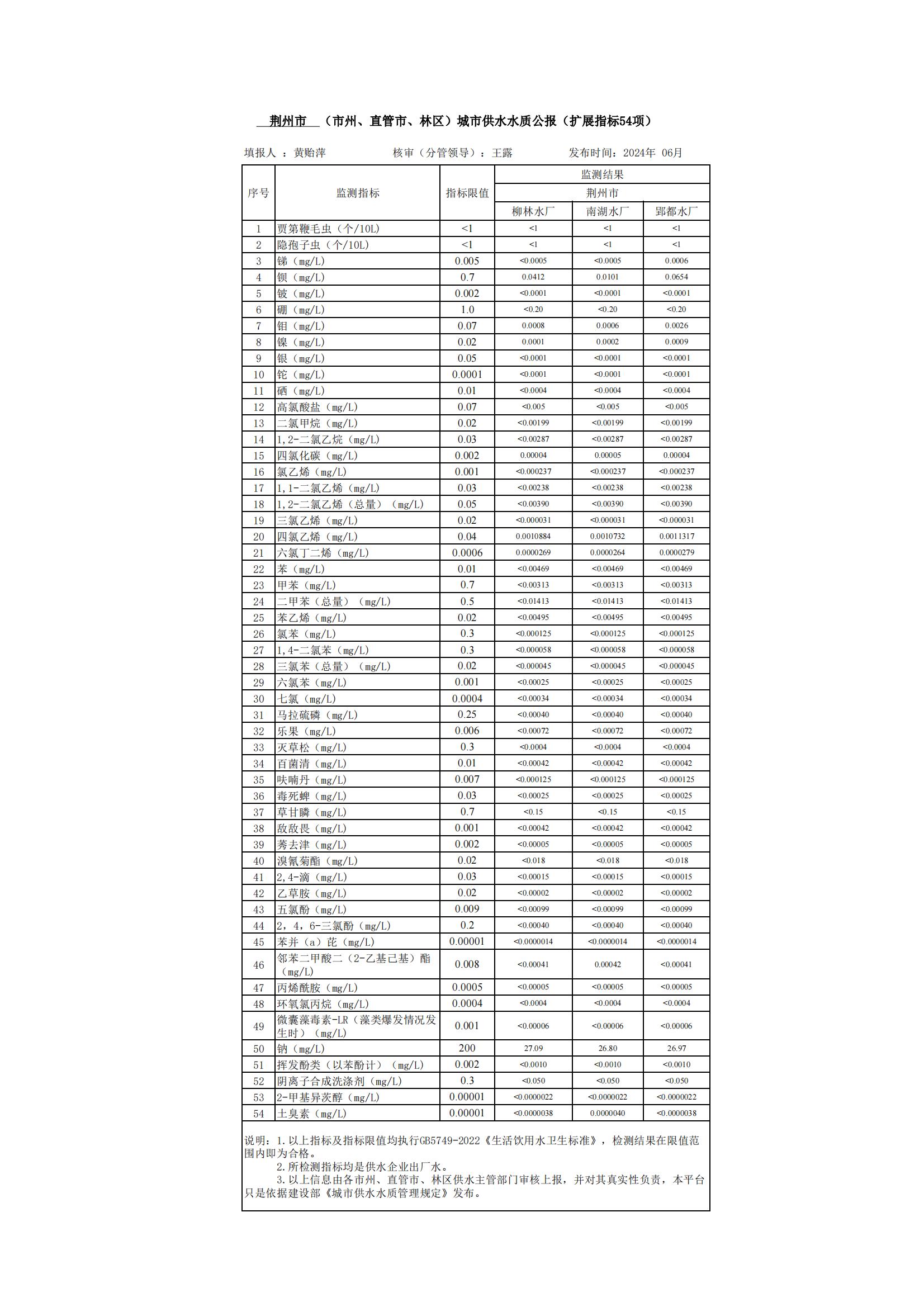 2024年上半年荊州市城市供水水質(zhì)公報(bào)(擴(kuò)展指標(biāo)54項(xiàng))