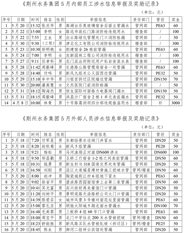 據(jù)了解,為了切實保障城市供水設(shè)施安全,進一步增強市民的節(jié)水意識,打擊各種違法違章用水行為,規(guī)范供用水市場秩序,荊州水務(wù)集團面向全社會開展“有獎報漏”的活動。鼓勵市民對供水設(shè)施漏損現(xiàn)象及違法、違章用水行為進行舉報,一經(jīng)核實,將給予現(xiàn)金獎勵。