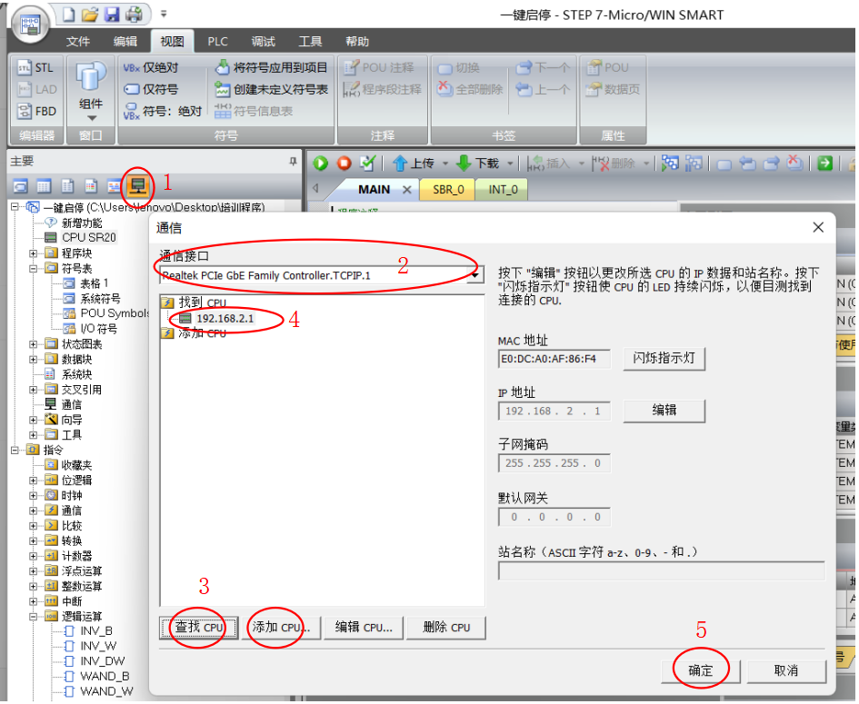 3.打開STEP 7-MicroWIN SMART編程軟件,在導(dǎo)航欄中找到通信,點(diǎn)擊進(jìn)入(如圖五所示),首先設(shè)置通信接口(根據(jù)我們的連接方式和網(wǎng)卡選擇),然后再點(diǎn)擊查找,等待搜索到我們的PLC,再點(diǎn)擊確定,完成通信連接。此處需要注意的是:通過查找如果找不到我們的PLC,我們還可以通過添加,手動(dòng)添加PLC的IP;