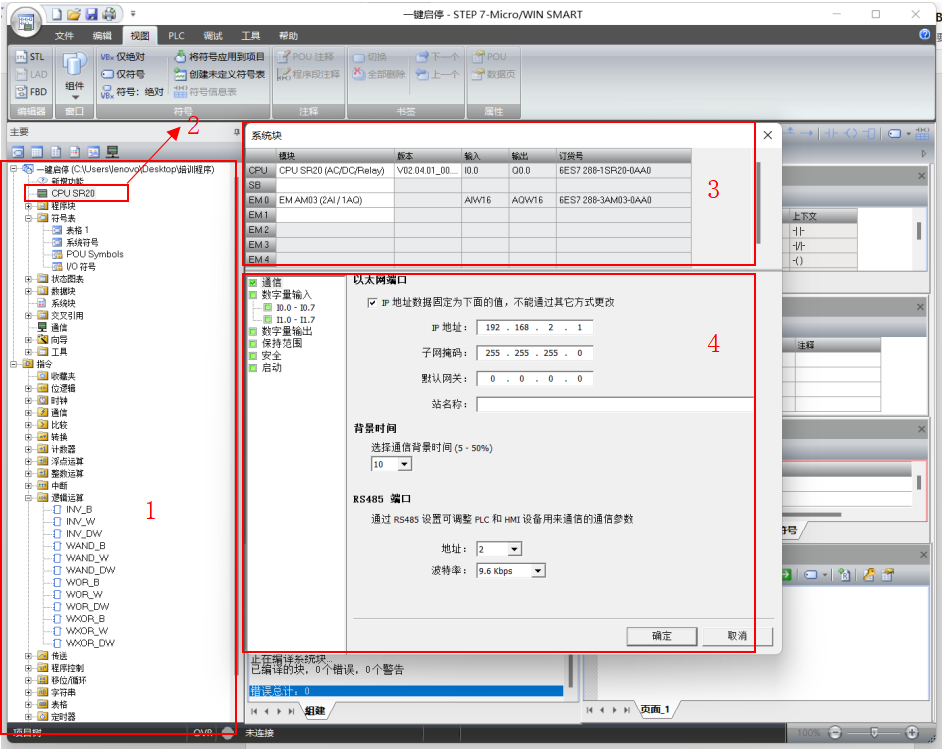 如圖二所示是PLC設(shè)備組態(tài)基本操作步驟,具體步驟如下: 找到項(xiàng)目樹; 在項(xiàng)目樹中找到CPUSR20(注意:CPU后面的數(shù)字和使用的PLC型號(hào)相同); 根據(jù)項(xiàng)目實(shí)際使用的物理組態(tài),在系統(tǒng)塊中配置相應(yīng)的組態(tài)。需要注意的有:(1)組態(tài)中的SB(第二行)是CPU的擴(kuò)展模塊,可以擴(kuò)展通信和模擬量,沒有可以空著;(2)組態(tài)順序要和物理組態(tài)一一對應(yīng); 模塊參數(shù)設(shè)定;可以根據(jù)實(shí)際使用情況對組態(tài)的各個(gè)模塊進(jìn)行參數(shù)設(shè)定; 以上四步就是PLC的設(shè)備組態(tài)設(shè)定,組態(tài)設(shè)定完成后要按確定保存,然后再下載到PLC中,并觀察PLC是否有報(bào)錯(cuò),如無報(bào)錯(cuò),說明組態(tài)完成。