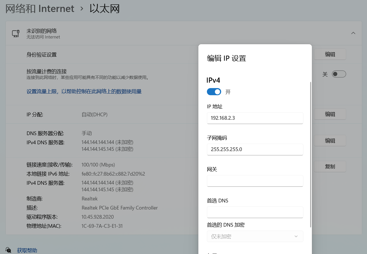 2.打開電腦的網(wǎng)絡(luò)設(shè)置,更改電腦IP和子網(wǎng)掩碼。此處需要注意的是,電腦的IP需要和PLC的IP在同一網(wǎng)段,且不能相同。如圖四所示;