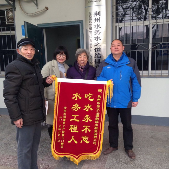 沙市區(qū)迴瀾巷土產(chǎn)宿舍的老人們非常感動(dòng),大家自發(fā)地為水之道公司送來錦旗,感嘆“吃水永不忘水務(wù)工程人”,稱贊荊州水務(wù)集團(tuán)發(fā)揚(yáng)當(dāng)代雷鋒精神,用一顆為人民服務(wù)的心給老人們帶來春天般的溫暖。
