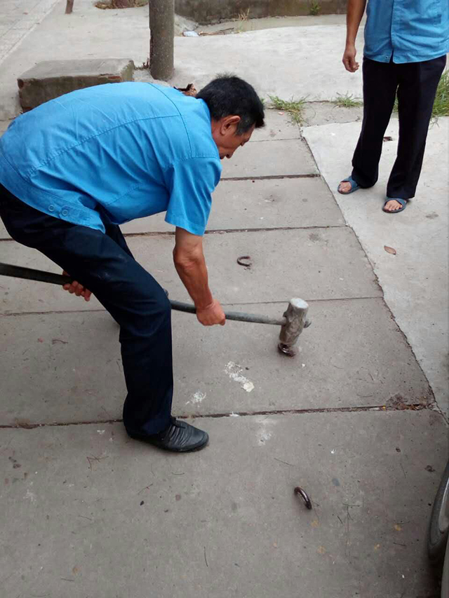 6月3日,搶修隊(duì)接到一項(xiàng)特殊的任務(wù),有市民反映沙市區(qū)長(zhǎng)港路教育考試院旁邊的人行橫道上,一排水泥板上的鐵栓存在安全隱患。由于鐵栓高出路面,稍不注意就成了市民出行的“絆腳栓”。荊州電視臺(tái)《江漢風(fēng)》欄目在5月29日的節(jié)目中對(duì)此事也進(jìn)行了報(bào)道,附近的居民被這樣的“絆腳栓”絆倒,且傷勢(shì)不輕。《江漢風(fēng)》欄目記者幫助傷者多方聯(lián)系這些“絆腳栓”的產(chǎn)權(quán)單位,卻都未果。