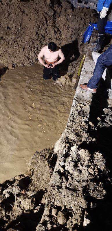 面對險情和搶修任務(wù),搶修隊員們不敢有半點耽誤,沒有絲毫猶豫立即按照方案開始了工作。6點30分,他們將附近的DN400的閥門關(guān)閉一半,水量略有減小。班長鄭倫軍見狀主動請纓,穿戴好設(shè)備下到泥水坑中開始查找管漏部位,其他同事加緊抽排積水配合施工??墒沁€沒趟上兩三步,鄭倫軍的衣服就已被泥水全部打濕?!斑@樣干活太不方便,又耽誤時間”,他一邊說著一邊脫掉上衣,最后干脆打著赤膊彎著身子在泥水中來回探摸。他這一干就是40分鐘,此時室外溫度已經(jīng)接近零度,寒氣逼人。大伙都替他感到擔(dān)心,連忙喊他上來換人接著干,可老鄭一邊擺手一邊說道:“快了,快了?!?點正,老鄭終于摸到了漏點,接下來便摸索著將木楔打入漏點進(jìn)行止水。憑著多年豐富的維修經(jīng)驗和嫻熟的技巧,他將一個又一個木屑打的又準(zhǔn)又牢。隨著積水的慢慢褪去,漏點終于呈現(xiàn)在了大家的面前,直到這會兒老鄭才稍稍松了口氣,大伙趕緊把他泥坑中拉了上來,套上衣服給他取暖。此時的他已凍得嘴唇發(fā)白、渾身直打哆嗦,可嘴里卻還說:“沒事,我身體好著呢”。