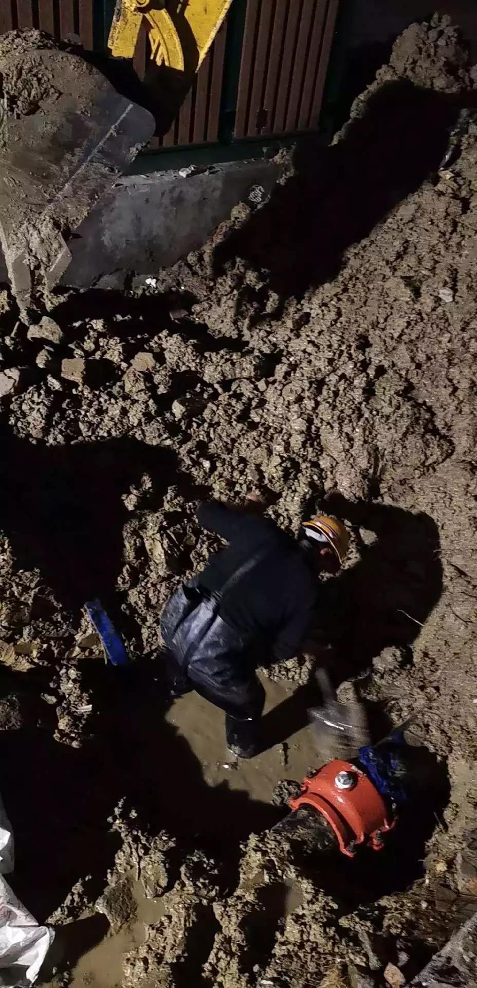 1月18日晚17時,位于荊州區(qū)北辰天街恒大影院附近DN200的供水管道被道路施工人員挖破,奔騰的自來水噴涌而出,迅速將周邊淹成一片汪洋,過往的行人和車輛無不紛紛避讓。接到任務(wù)后,荊州水務(wù)集團管網(wǎng)管理部經(jīng)理張凌帶隊迅速趕到現(xiàn)場,只見發(fā)生爆管的管道已被自來水和泥水所淹沒,現(xiàn)場一片狼藉,積水深處已達(dá)一米。
