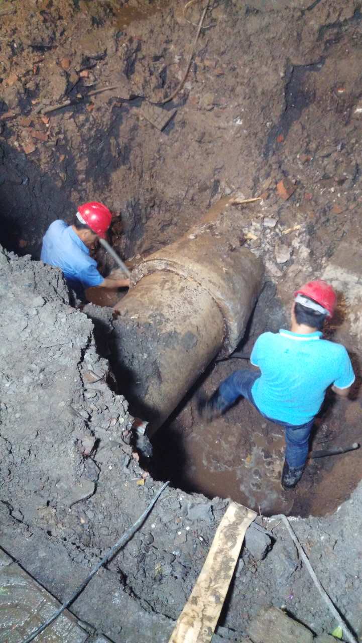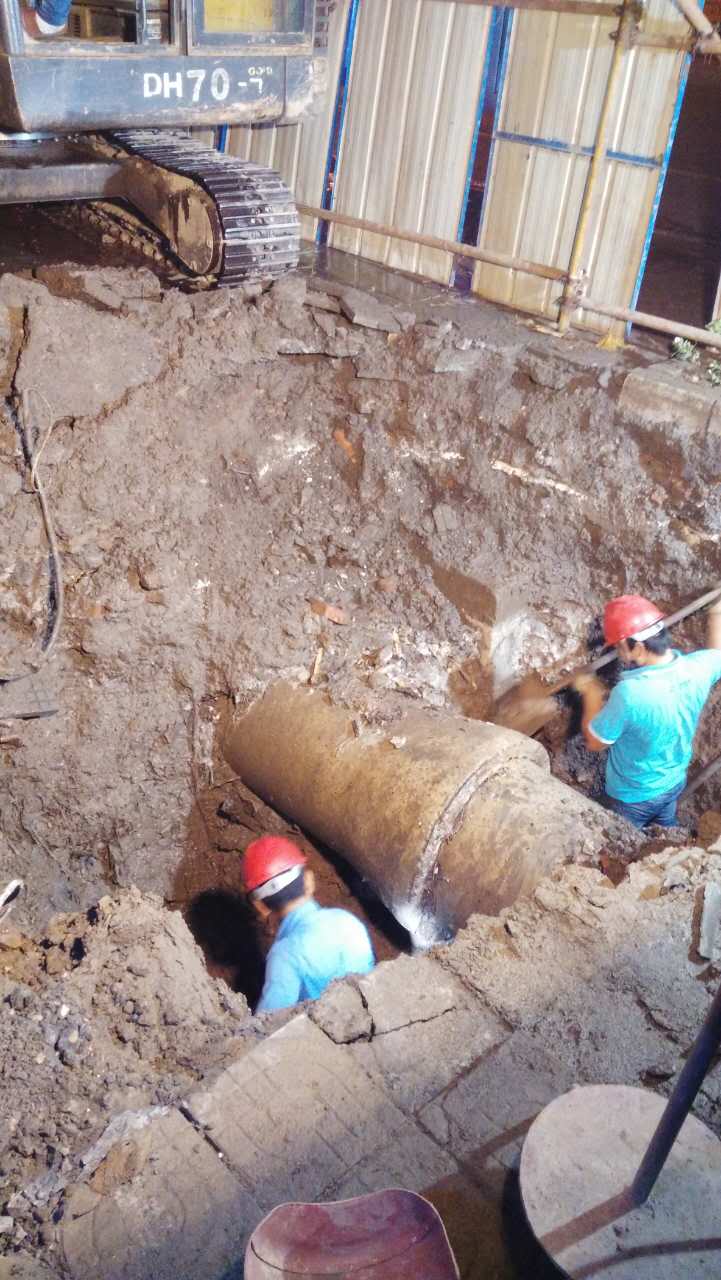 攻堅(jiān)克難、全力搶修:在安全防護(hù)措施進(jìn)行的同時(shí),搶修工作有條不紊的進(jìn)行。挖掘設(shè)備迅速破路、開挖,排水設(shè)備也開足馬力進(jìn)行排水。由于爆管主管管位距路邊不足一米,與原有路基間隔過近,管網(wǎng)搶修人員隨后進(jìn)行人工開挖,在凌晨?jī)牲c(diǎn)圓滿完成搶修,恢復(fù)供水。
