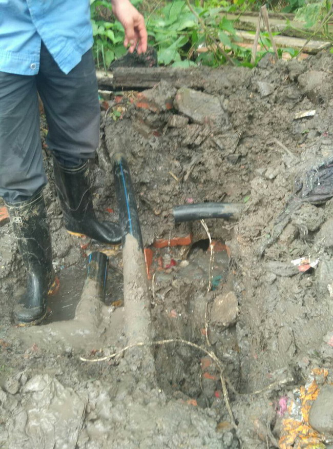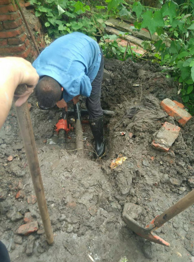 當(dāng)日荊州水務(wù)集團(tuán)管網(wǎng)搶修隊(duì)接到搶修命令后迅速帶上搶修設(shè)備冒雨前往新華村。到達(dá)現(xiàn)場(chǎng)后,管網(wǎng)搶修隊(duì)首先要找到事故源頭,而此時(shí)雨越下越大,絲毫沒有停止的跡象。新華村管線附近一片汪洋,能見度極低,搶修隊(duì)員只好兵分幾路穿著雨衣挽起褲管,趟跳進(jìn)水里進(jìn)行仔細(xì)排查。下午2點(diǎn)40分,終于在新華村進(jìn)水主管附近發(fā)現(xiàn)一處明顯有清水翻涌而出,憑借搶修隊(duì)員經(jīng)驗(yàn)判斷,此處可能就是造成停水的主要原因。原來,此處的DN200PE供水水管由于短時(shí)間暴雨的沖刷浸泡裸露在外,外力作用下導(dǎo)致突然斷裂,造成了此次停水事故。找到漏點(diǎn),搶修隊(duì)員迅速關(guān)閉閥門,冒雨實(shí)施搶修作業(yè)。經(jīng)過4個(gè)小時(shí)連續(xù)作業(yè),恢復(fù)了供水。由于搶修及時(shí),該處居民的正常生活未受到影響。