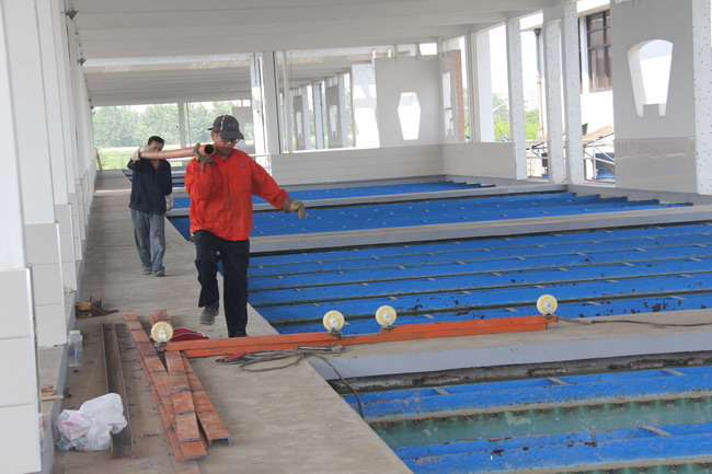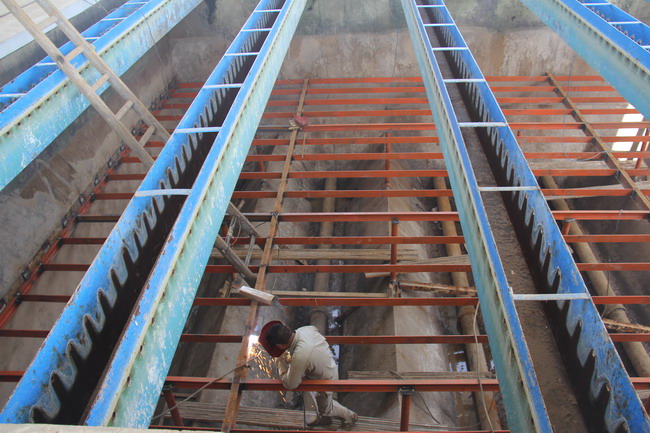 本次工程將對(duì)8口沉淀池的鋼筋托架、斜管蜂窩以及集水槽全部更新,集水槽將由原來(lái)使用的鑄鐵更換為不銹鋼材質(zhì)。為不影響城區(qū)正常供水,柳林水廠對(duì)整個(gè)工程進(jìn)行了周密安排,采取8口沉淀池按序改造的方法,每次只停一口沉淀池,同時(shí)合理調(diào)度其他水廠的供水,保障城區(qū)水壓均衡。經(jīng)過(guò)前期的準(zhǔn)備,目前,1#沉淀池鋼筋托架的更換已經(jīng)開(kāi)始,不銹鋼集水槽的制作也在同時(shí)進(jìn)行。