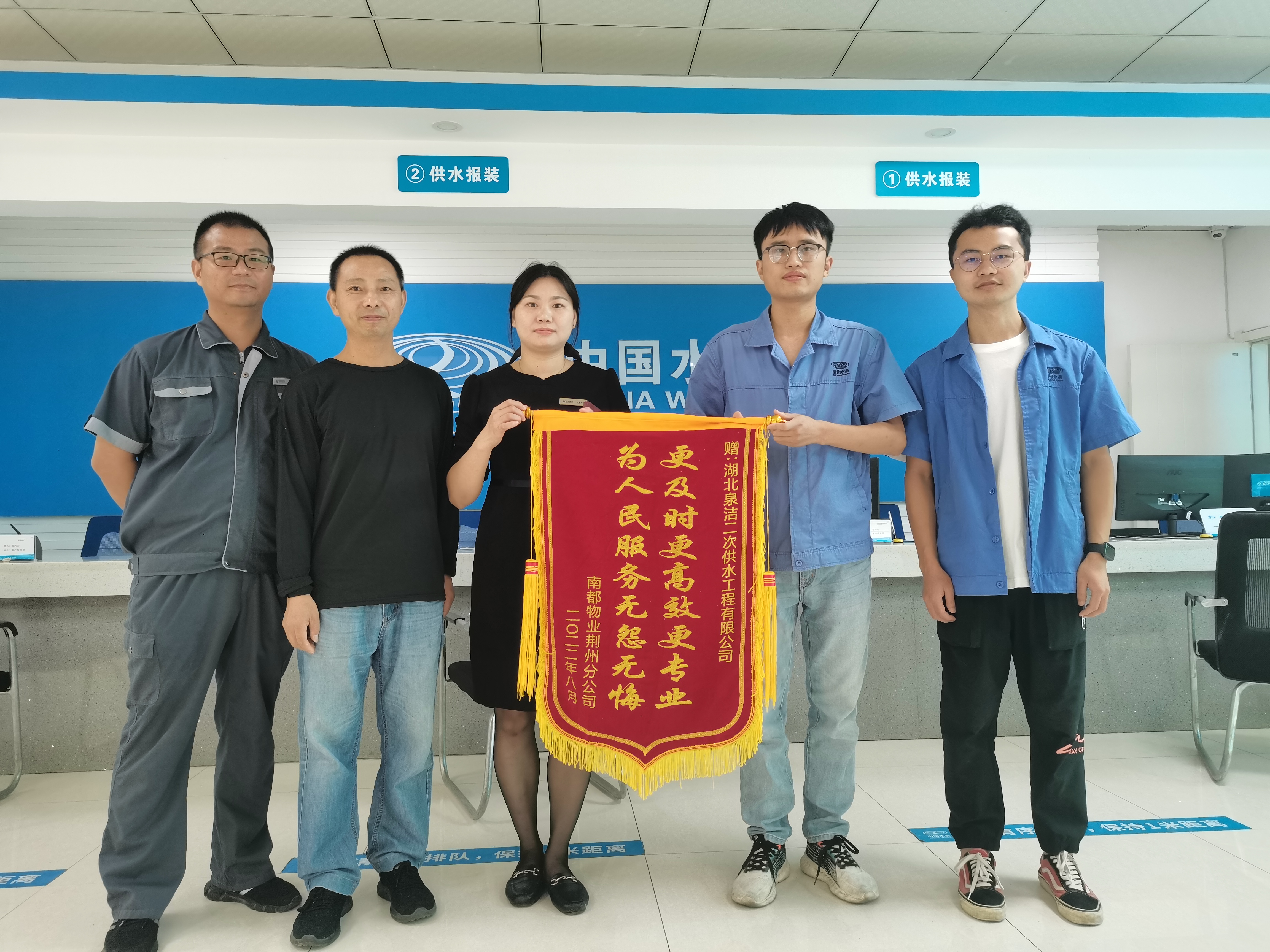 在8月30號,綠地二期南都物業(yè)荊州分公司負(fù)責(zé)人到南湖客戶服務(wù)中心送來一面“為人民服務(wù)無怨無悔,更及時更專業(yè)更高效”錦旗,對湖北泉潔二次供水工程有限公司專業(yè)及時的維修效率表達(dá)由衷的感謝。