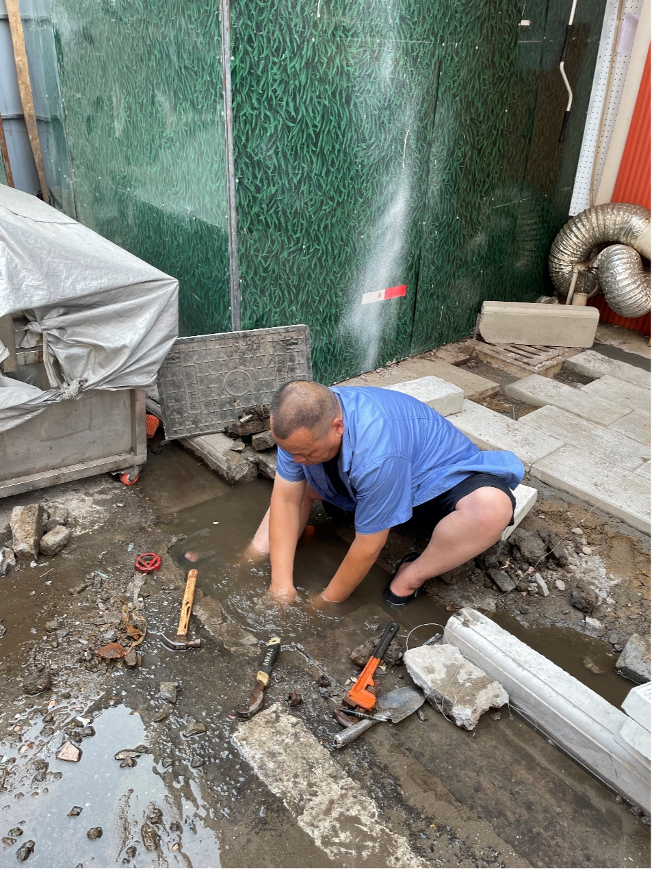 當(dāng)天下午2點(diǎn),江漢客服中心收到來(lái)自大賽巷美食街商戶的求助,他反映門面表后漏水,但因閘門被埋,無(wú)法關(guān)閘維修,請(qǐng)求水務(wù)集團(tuán)給予協(xié)助。接到用戶訴求后,負(fù)責(zé)維修的服務(wù)人員陳勁鵬第一時(shí)間到達(dá)現(xiàn)場(chǎng),經(jīng)過(guò)查看發(fā)現(xiàn)該用戶的閥門被埋于水泥青磚下,現(xiàn)場(chǎng)條件對(duì)維修非常不力,而且冒水的地面讓周圍的門面也先后出現(xiàn)了低壓無(wú)水的情況,嚴(yán)重影響了商戶們的正常經(jīng)營(yíng),用戶焦急萬(wàn)分。