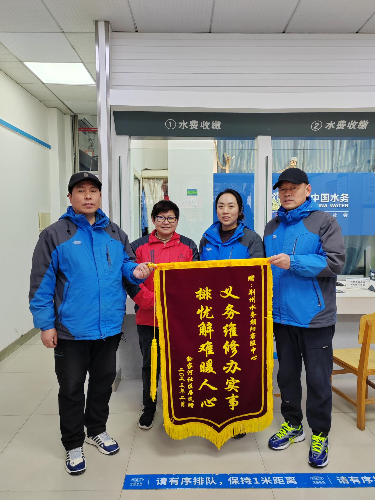 2023年2月15日上午,孫家河社區(qū)一居民將一面繡有“義務(wù)維修辦實(shí)事,排憂維修暖人心”的燙金錦旗送至朝陽(yáng)客服中心抄表員的手中,對(duì)其盡心盡職、熱情周到的服務(wù)、上門免費(fèi)義務(wù)維修、解決居民的用水難題、及時(shí)緩解鄰里矛盾表示高度贊揚(yáng)和誠(chéng)摯感謝。