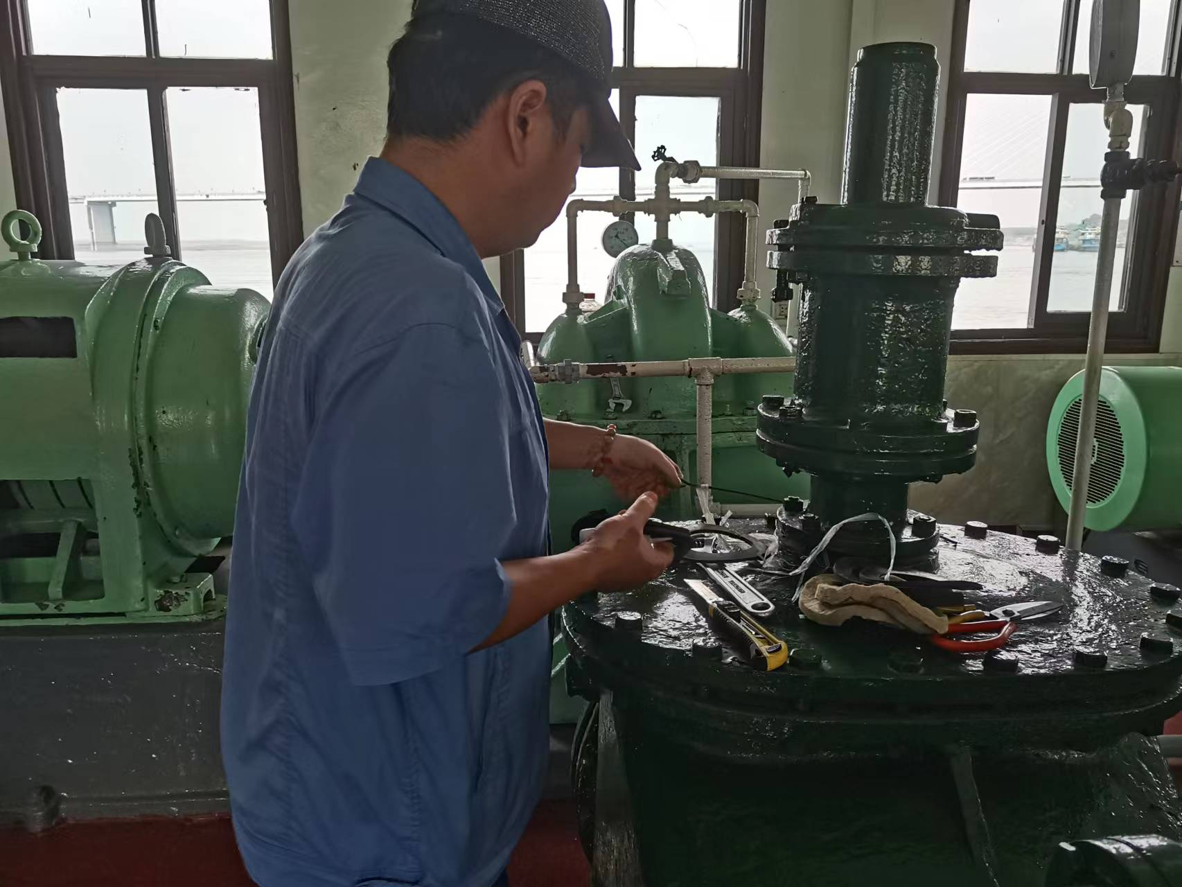 6月17日早上7點08分,正值節(jié)假日用水早高峰時段,南湖水廠取水泵船值班員在巡檢時發(fā)現(xiàn)取水4號機組逆止閥處閥體左側(cè)有大量水噴濺,為確保水泵電機安全,在通知廠部后值班人員及時關(guān)停了4號機組和水泵進出口閥門。