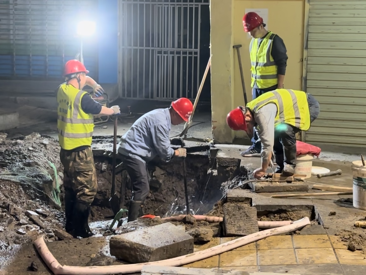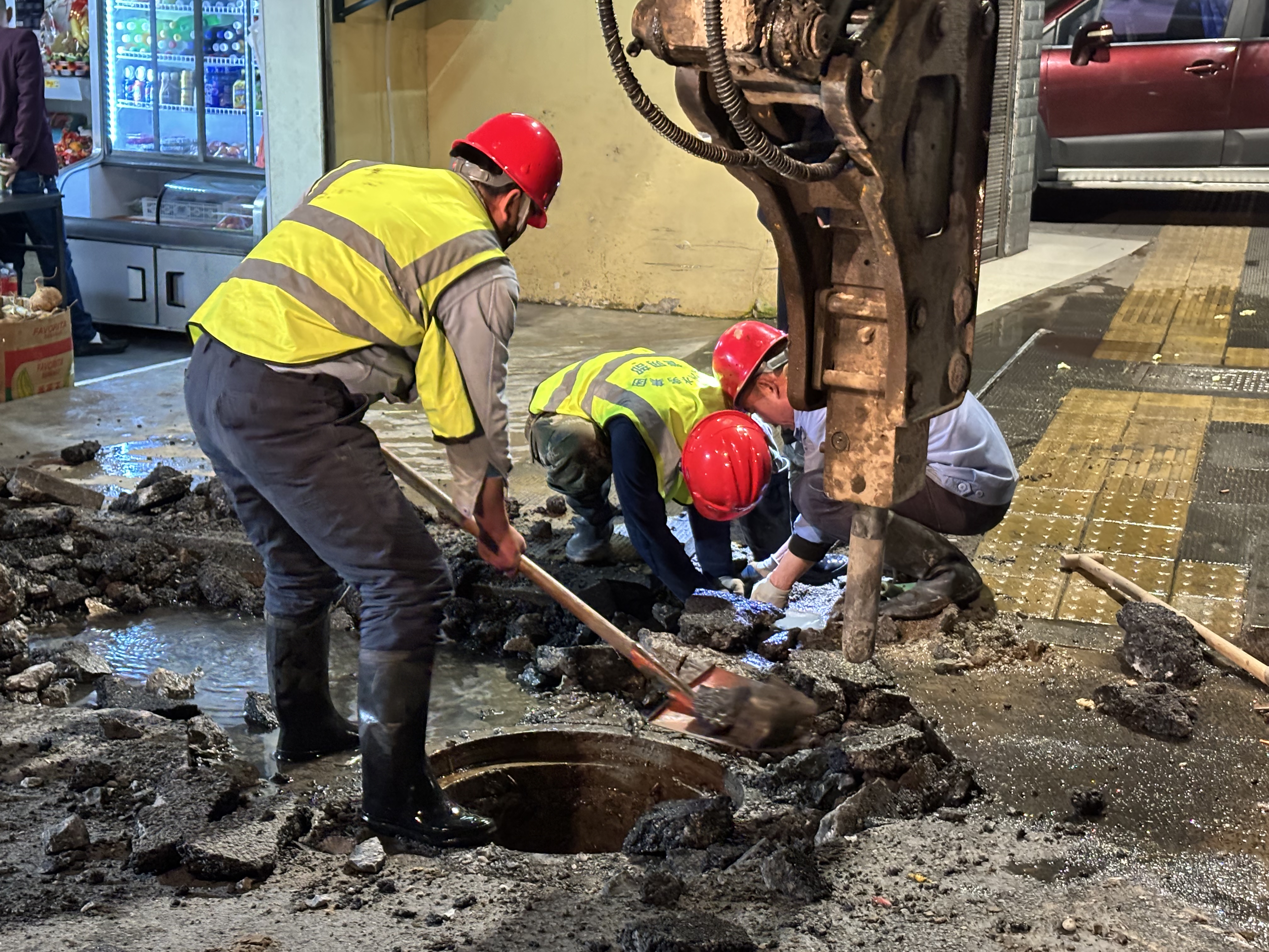 搶修方案確定后,荊州水務(wù)集團(tuán)通過媒體宣傳、社區(qū)工作群等方式提前做好停水告知工作,完成了施工機(jī)械、材料、技術(shù)人員調(diào)配,28日深夜11:30開始關(guān)停主管閘門,搶修工作進(jìn)入攻堅(jiān)階段。經(jīng)過與相關(guān)管線部門交涉后得知,該處主管西側(cè)有6根電纜,主管正下方除了有40cm的水泥石塊混合墊層外,還有市政排水管呈十字交叉排列,下方開挖只能采取人工開挖的方式。為在天亮前完成搶修任務(wù),管網(wǎng)搶修隊(duì)調(diào)配6名搶修員輪流開挖作業(yè)坑,與以往開挖不同的是,此次開挖要挖除的不止是泥土,還有堅(jiān)硬的水泥石塊混合墊層。
