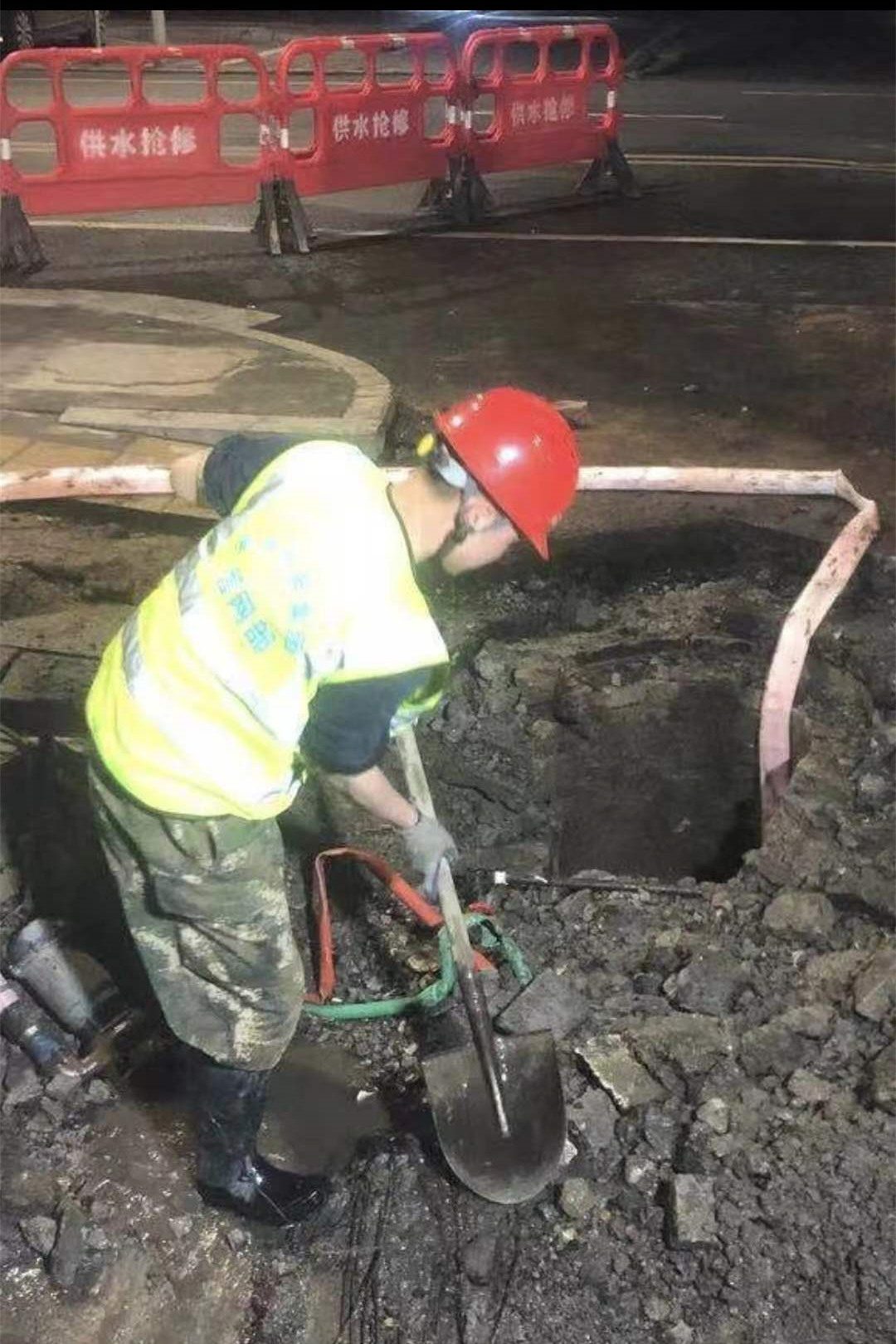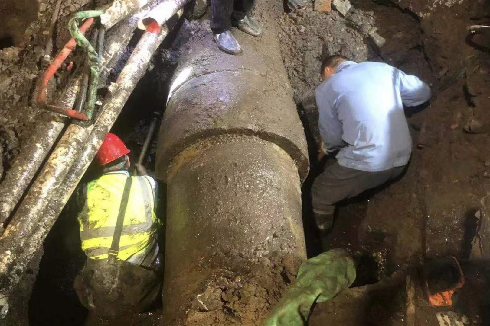 此外,搶修現(xiàn)場的環(huán)境也極為復(fù)雜。爆管位置西側(cè)有電纜交錯(cuò),正下方則是水泥石塊混合墊層與市政排水管的十字交叉排列。這使得開挖工作變得異常困難,只能采取人工開挖的方式。在夜間視線不佳的條件下,搶修人員需要小心翼翼地進(jìn)行開挖,避免損傷到其他管線。