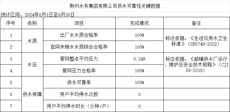 2024年6月荊州水務(wù)集團(tuán)有限公司供水可靠性關(guān)鍵數(shù)據(jù)