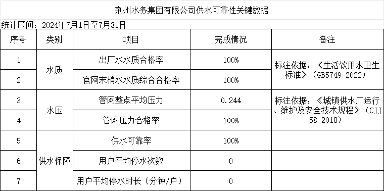 2024年7月荊州水務(wù)集團(tuán)有限公司供水可靠性關(guān)鍵數(shù)據(jù)