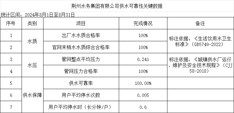 2024年8月荊州水務(wù)集團(tuán)有限公司供水可靠性關(guān)鍵數(shù)據(jù)