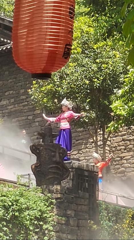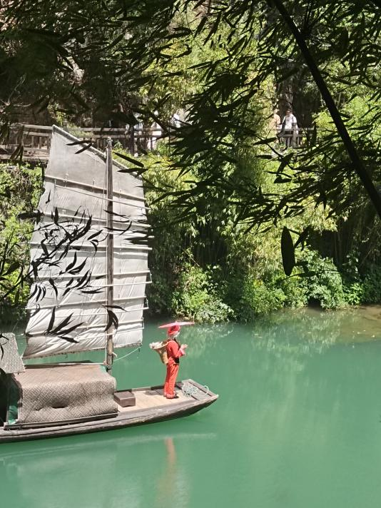 浮光掠影,靜影沉璧。光灑在清江上,兩岸的綿延青山映在水面上,風輕輕拂過,船慢慢游過,波紋一圈一圈的蕩漾開來,心神也隨之變得寬廣起來;幡隨風動,心隨意動。石頭鑿平砌就的三層舞臺上,穿著土家族特色服飾的妹子排著隊、登上臺,又分成三行迅速散開,先是一聲山歌式的吆喝傳來,鼓聲、嗩吶聲等伴奏聲也隨之而來,擺手舞節(jié)目開始了,臺下有舉著三峽人家的幡旗在前排游客面前走過,旗幟飄飄蕩蕩,后面跟著的是背著大竹簍的漢子們,背簍里裝的是滿滿當當?shù)墓?,展示著三峽土家族的特色人文風情。透過大樹葉子與裝飾的紅燈籠,我遠遠地看向舞臺,太陽當空而照,站在石墩上的幺妹跳著擺手舞,身上泛起一層光暈,頭上的銀飾隨著舞蹈動作晃動起來,垂落至額頭的流蘇也隨之律動起來,將絢麗的舞蹈感染力傳達給觀眾。臨近節(jié)目結(jié)束,鼓點越來越緊密,嗩吶與歌聲越來越高亢,幺妹舞動的身姿也越來越輕快,營造出歡快的氛圍,讓人沉浸其中,放松與快樂;光落下來,跳躍在山林間,新發(fā)的綠葉在大樹縫隙下曬著太陽,葉面熠熠生輝,不用太多語言修飾,靜靜的站在附近就能感知到一股蓬勃的生命力,不禁感嘆自然生命的獨特與頑強。