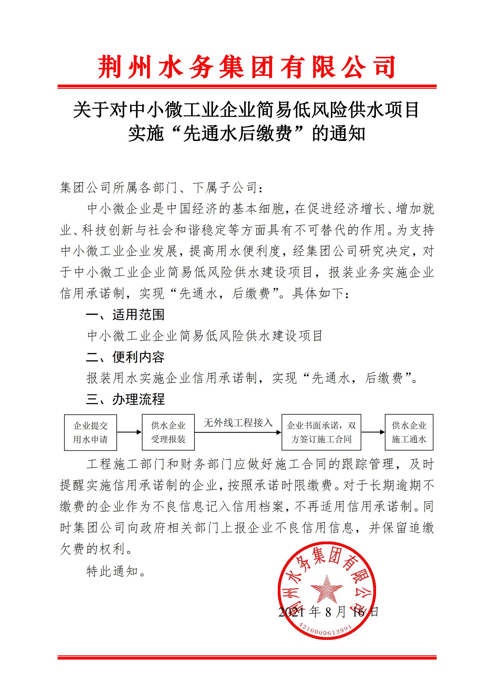 關(guān)于對(duì)中小微工業(yè)企業(yè)簡(jiǎn)易低風(fēng)險(xiǎn)供水項(xiàng)目實(shí)施“先通水后繳費(fèi)”的通知